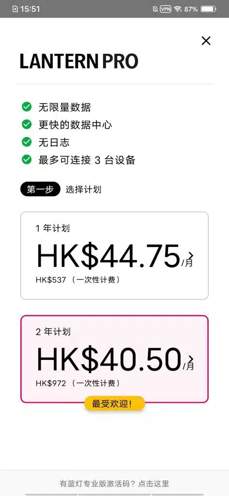 那么关于付费 VIP 的价格,首先你要注意到这里的价格单位为 HK ,也就是港币,并且蓝灯加速器只提供两种套餐的选择,1年计划和2年计划,没有短期的会员可供选择。