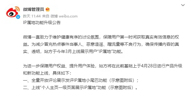 这是微博于2022年4月28日正式上线的展示用户IP属地功能,官方说明是:为了维护微博健康有序的讨论氛围,保障用户第一时间获取真实有效信息的权益。为减少冒充热点事件当事人、恶意造谣、蹭流量等不良行为,确保传播内容的真实、透明。因此,正式上线此功能。