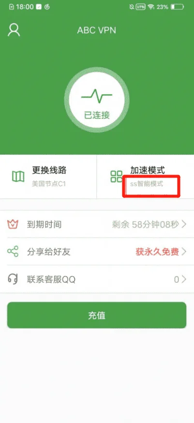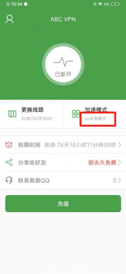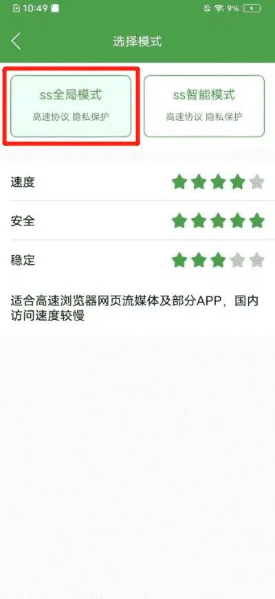 3、点击【加速模式】,把【ss智能模式】修改为【ss全局模式】(不同的加速器显示页面会有所不同,找到对应的全局按钮即可)。